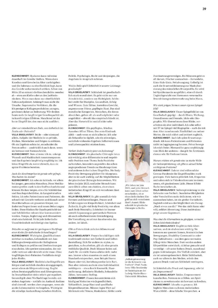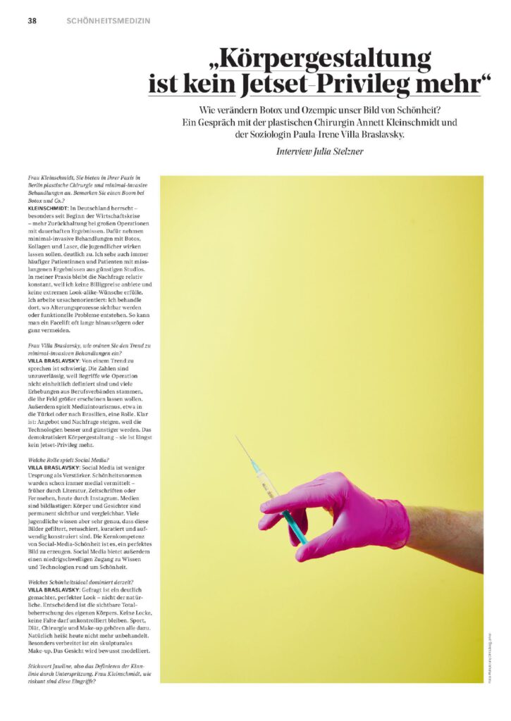 In der aktuellen Ausgabe des FAZ Magazins – Schönheit Spezial spricht Dr. Annett Kleinschmidt gemeinsam mit der Soziologin Villa Braslavsky über gesellschaftliche Körperbilder, neue Trends in der Schönheitsmedizin und den Wunsch nach Natürlichkeit.